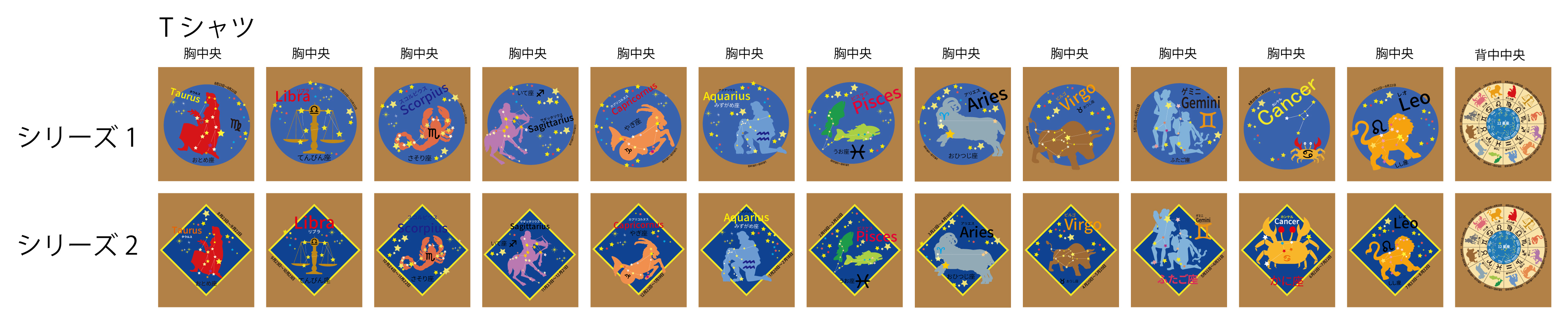 | 制作物名 | Tシャツデザイン_12星座2シリーズ一覧 |