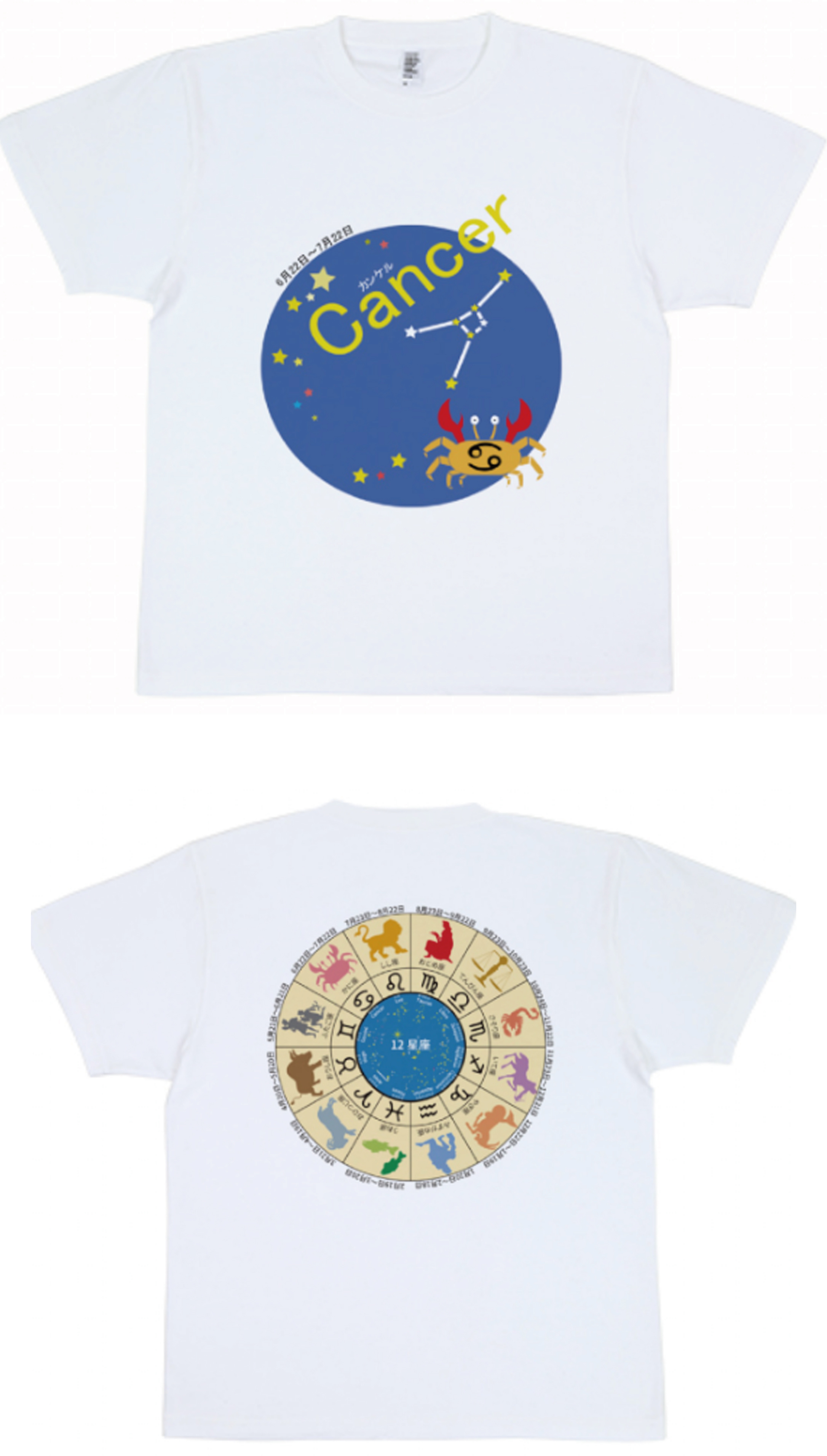 | Tシャツのデザインを描くのに、今回テーマを12星座にしぼって各星座や一覧などいろいろ描いてみました。かに座は自分の星座なので最初に手掛けました。 | |