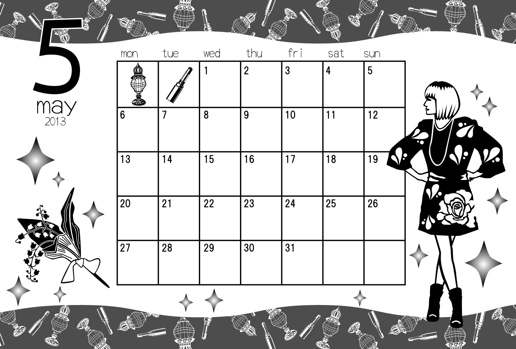 | 5月で春らしく、女性らしいカレンダーを作りました。 ポイントは、香水瓶と口紅の柄です♪ 春のいい香り、しませんか? | |