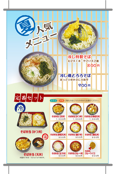| 以前制作させていただいたテーブルメニュー裏面(http://w3s.jp/dtps.php?id=187)をタペストリー印刷したものです。 | |