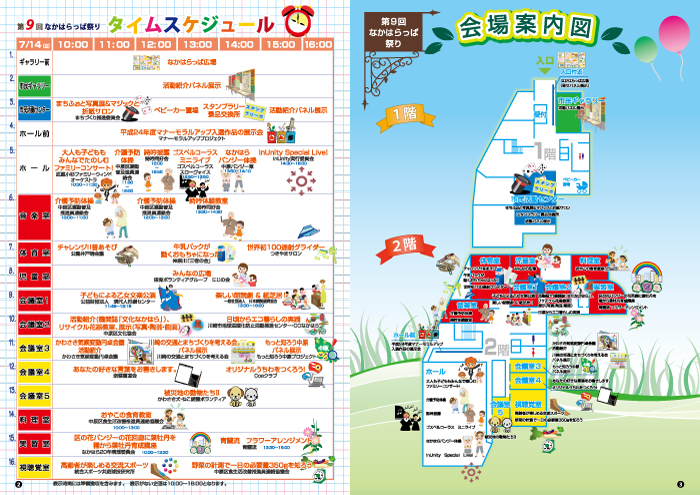 | なかはらっぱ祭り当日配布パンフレット 2−3P 担当者のドロップアウトの為、引き継ぎ制作したものになりますが、 採用されましたので、公開させていただきました。 | |