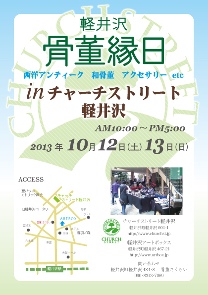 | チャーチストリートで行われる 骨董縁日のチラシになります。 デザインは前回同様で、日付と、地図の一部のみの変更となりました。 | |