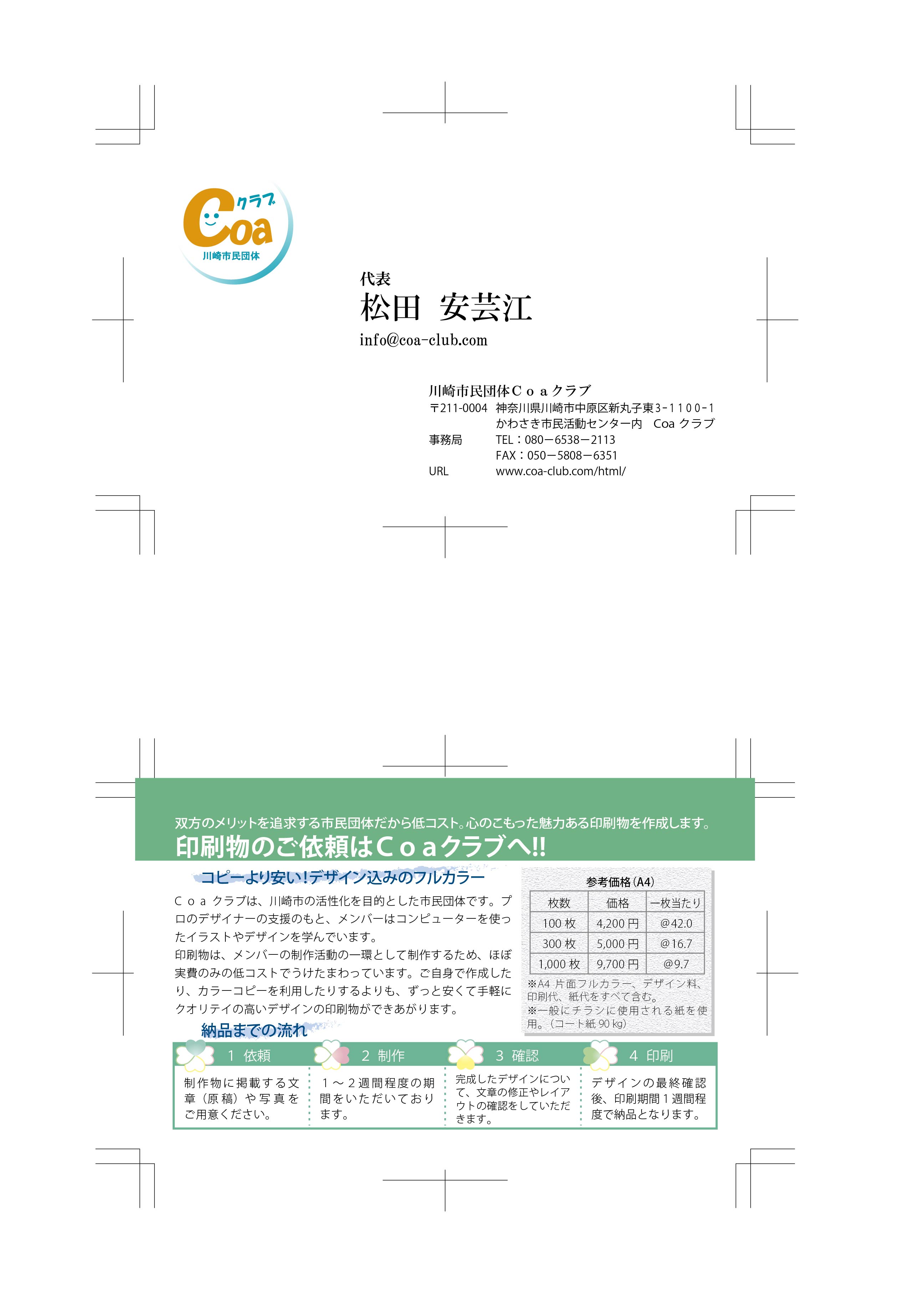 | Coaクラブの広告物をご利用いただくことで、顧客様によい出会い、幸運がありますように、という気持ちを込め、四葉のクローバーをモチーフとしました。連絡先がわかりやすいように、名前のすぐ下にメールアドレスを記載しております。 | |