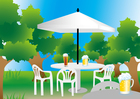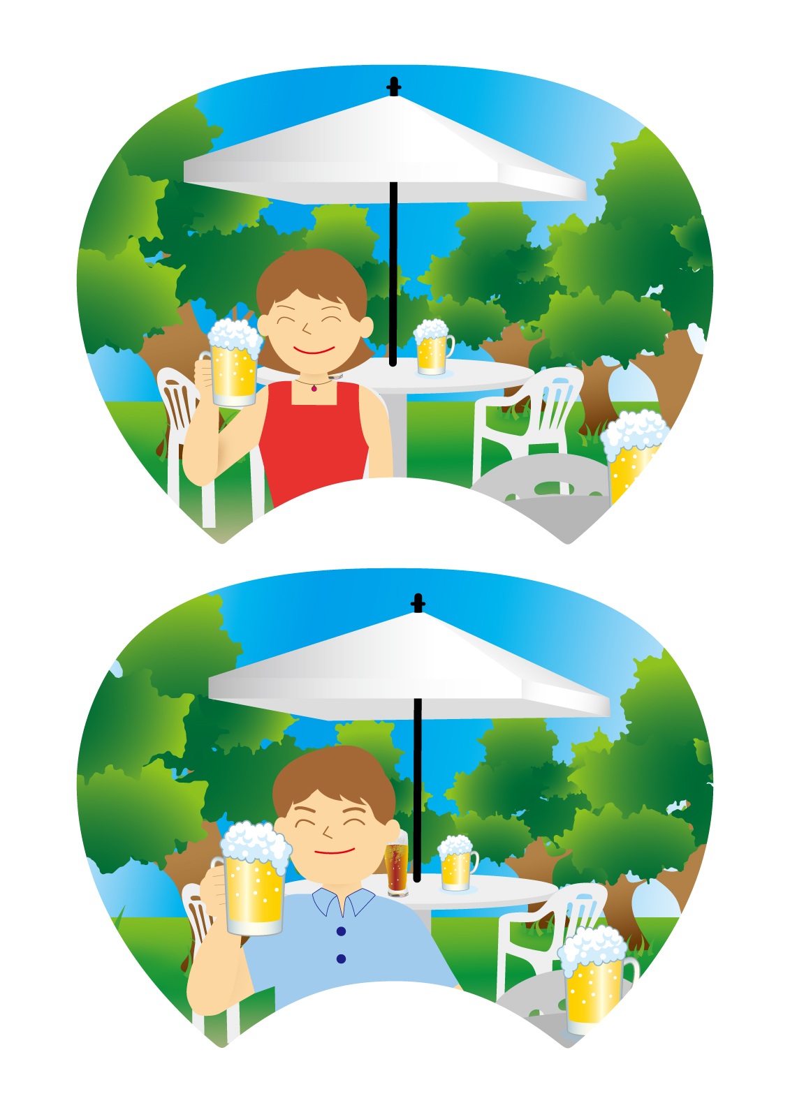 | 夏の風景でビヤガーデンにしました。 自然の中で美味しくビールを頂く幸せ。向かい側に友達がいます。爽やかな風が吹いています。 | |