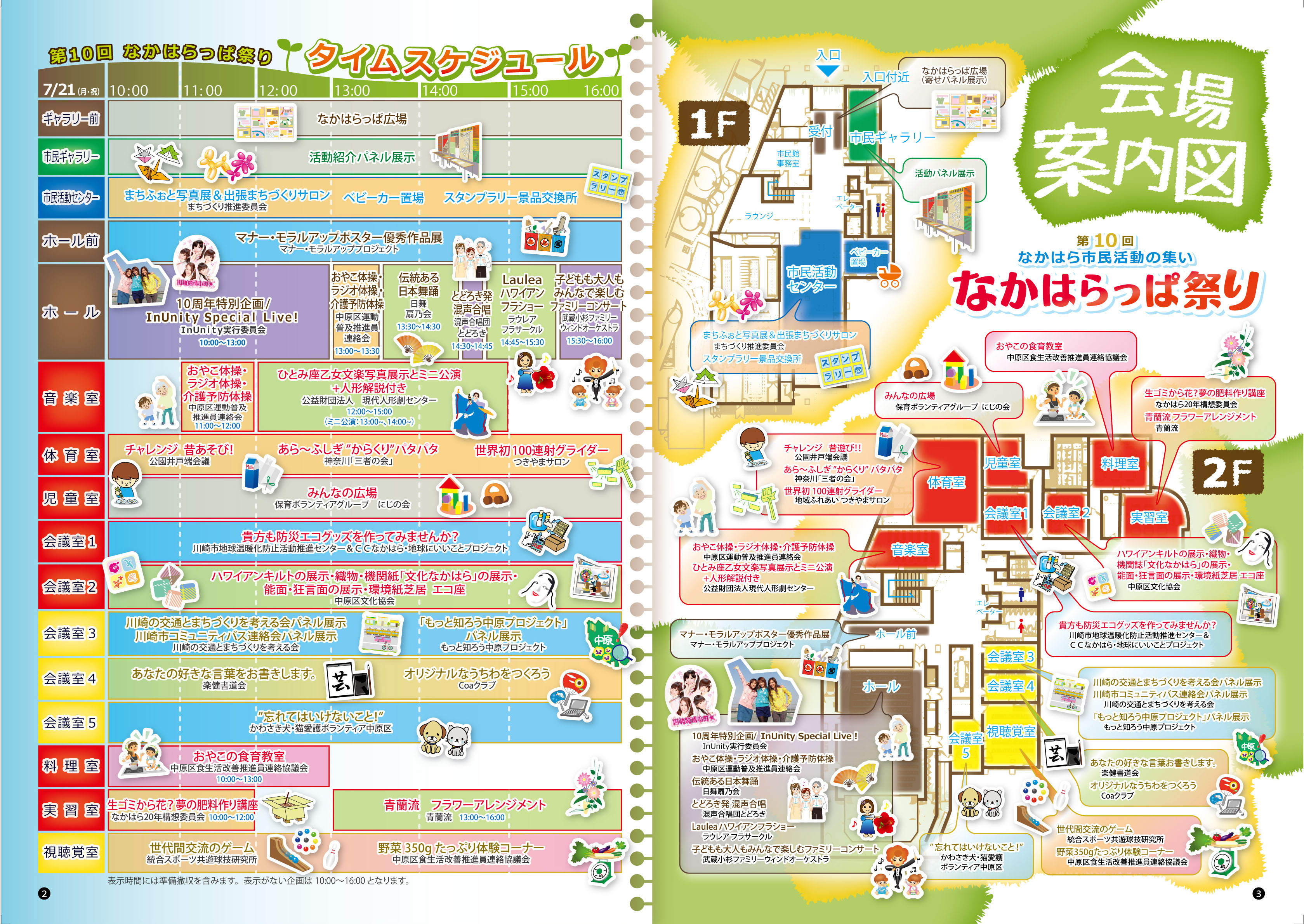 | 第10回なかはらっぱ祭りのp2-p3を担当しました。 色に統一感がなく見づらくて、たいへん反省しております・・・ | |