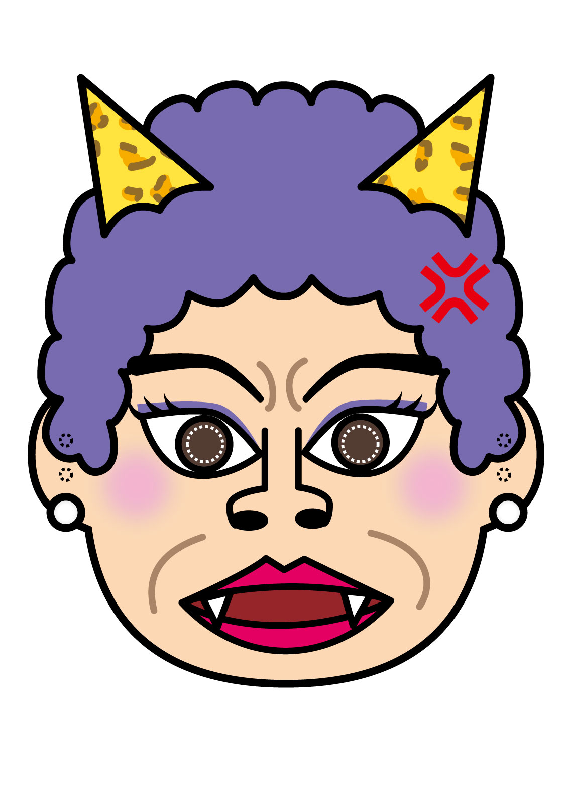 | 鬼のお面です。大阪のおばちゃんをイメージして作りました。 | |