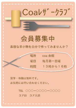 | レザークラフトや手工芸サークルのお知らせ、会員募集のチラシ・また作品展やフリーマーケットの看板、ポスター等に。 | |