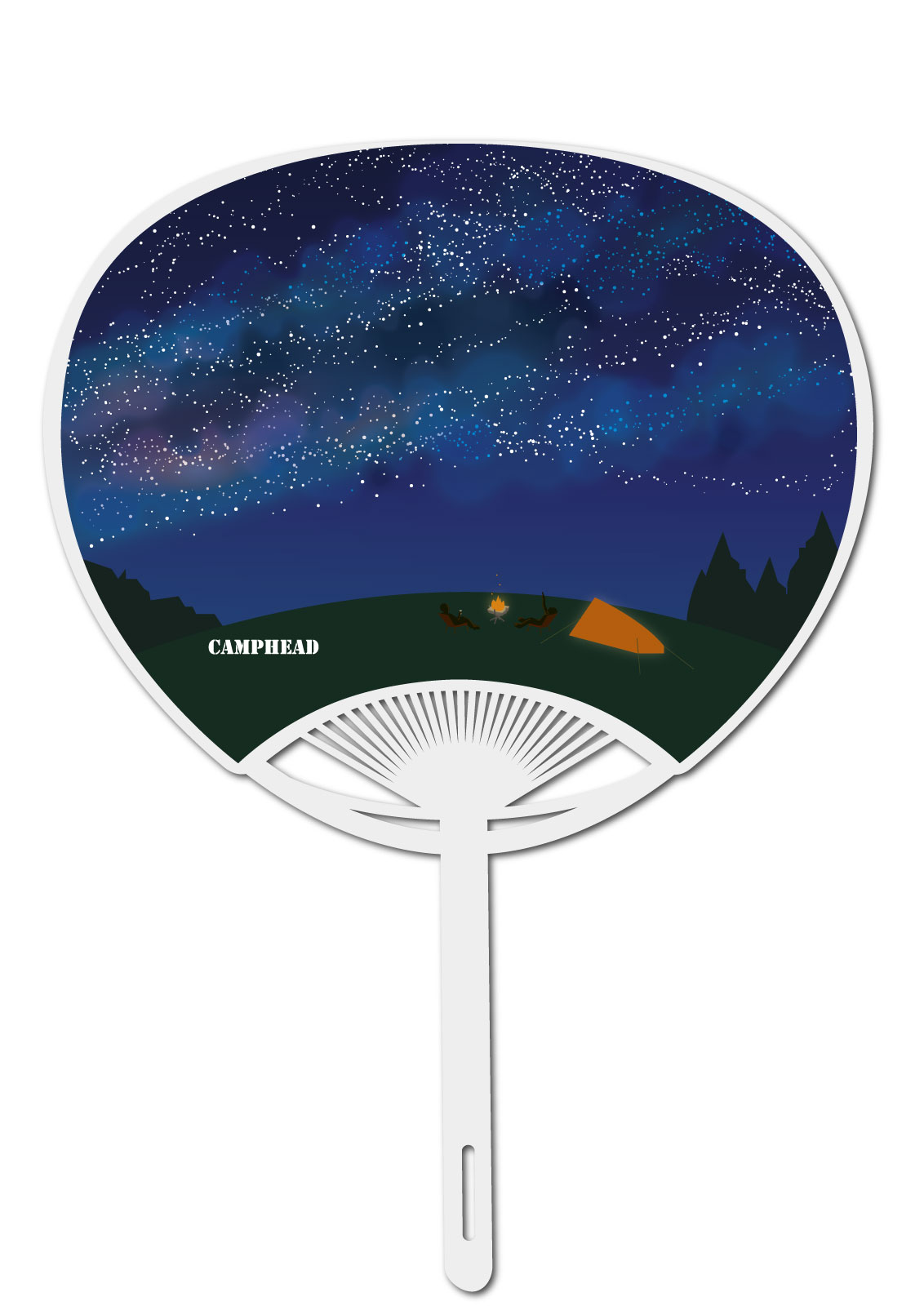 | なかはらっぱ用うちわです。天の川を眺めながらキャンプを楽しむ夏の夜、です。 | |