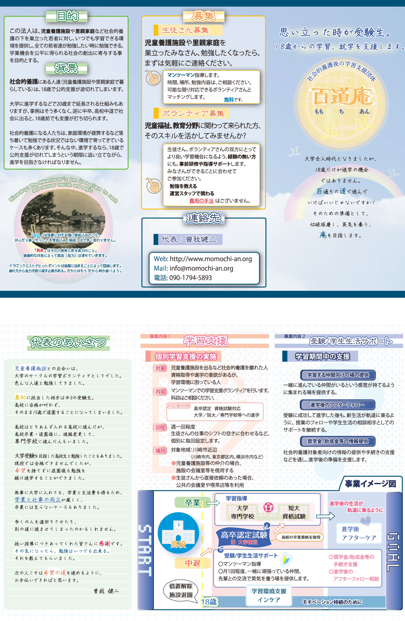 | 社会的養護後の学習支援団体「百道庵」さんの旗揚げパンフレットです。事業告知と生徒さん・ボラさんの募集がメインのテーマでしたが、3つ折りの紙面のなかに情報をうまく収めるのに苦労しました。 | |