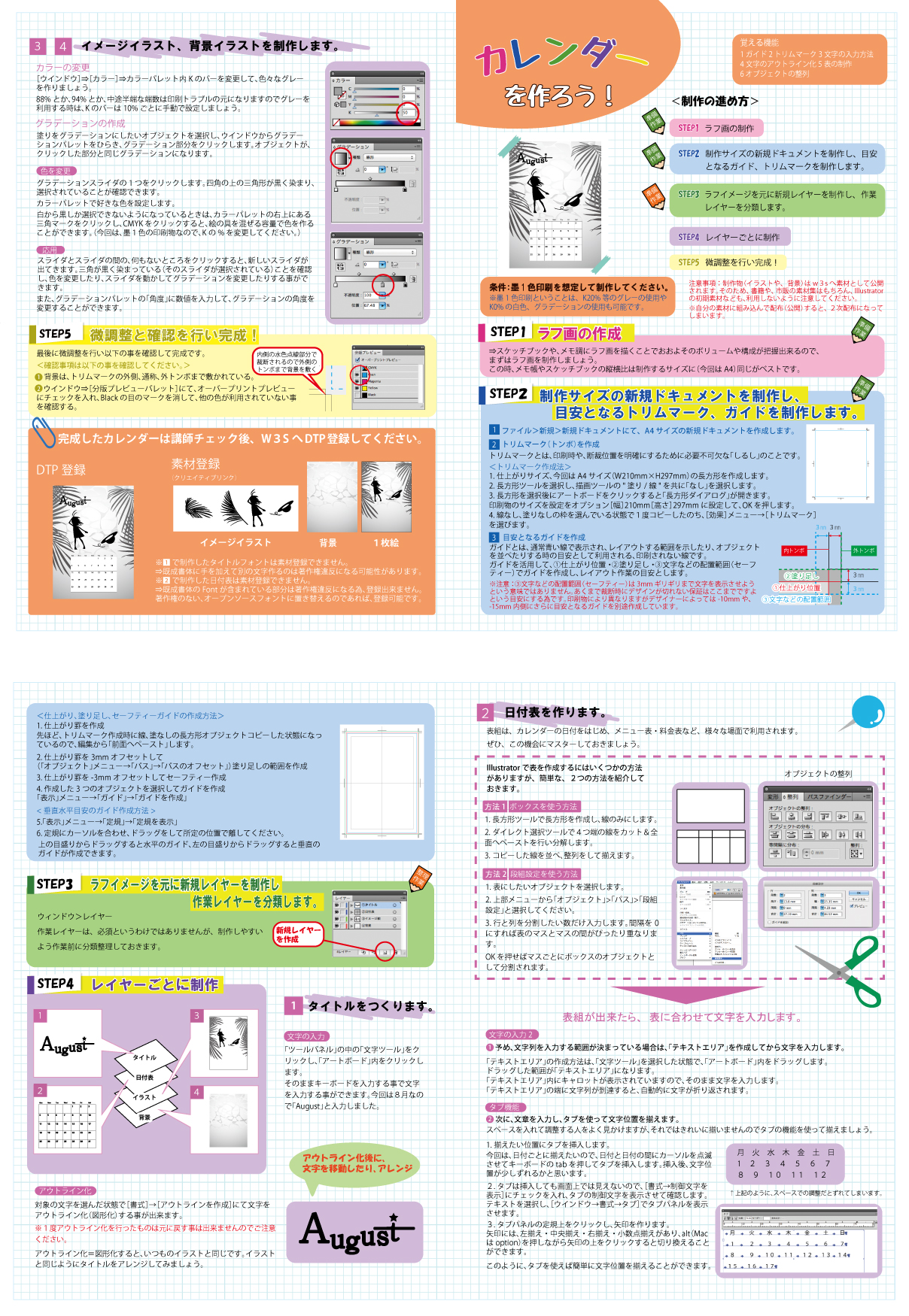 | カレンダーの制作マニュアルです。「楽しくつくる」をコンセプトに文房具を用いたカラフルなデザインにしました。 | |