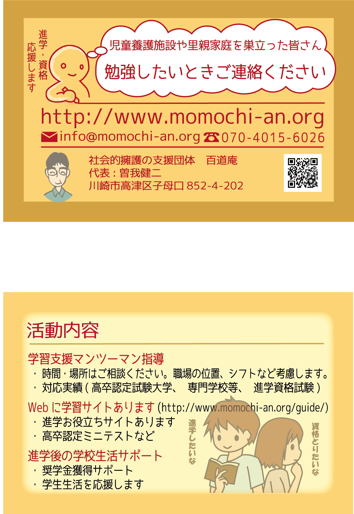 | 百道庵様 生徒募集カードです。資格・進学をとりたい若者を優しく応援するようなほんわかしたイメージで作成しました。 | |