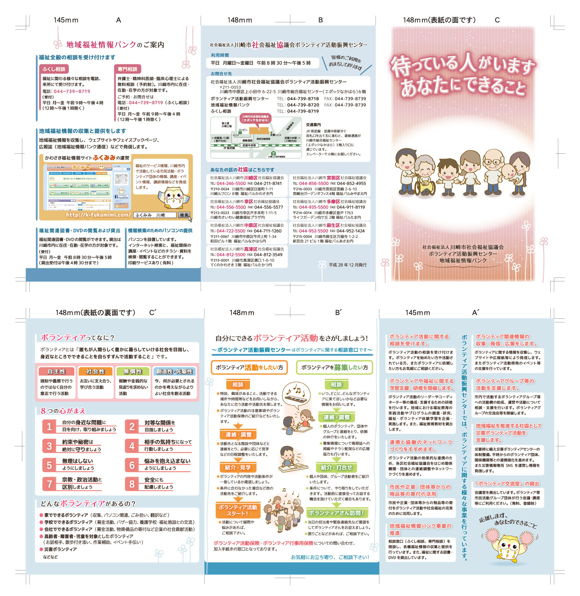 | ボランティア活動振興センター、地域福祉情報バンクの活動紹介リーフレットです。すっきり見やすいように心がけました。 | |
