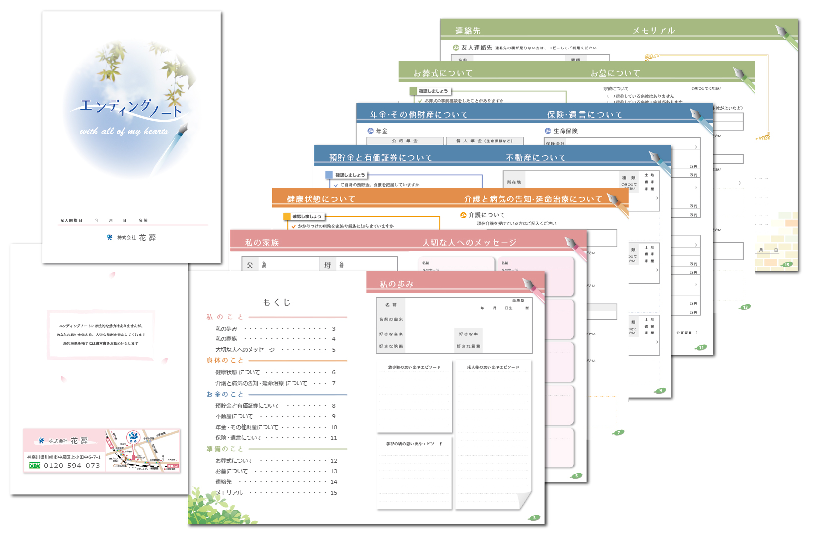 | 男性にも受け入れられるようなデザインを心がけました。どのような終わり方を望むのかを書きまとめる作業により、これからどう生きていくか考えさせられるのでは、とおもいます。エンディングノートがお役に立ちますように。 | |