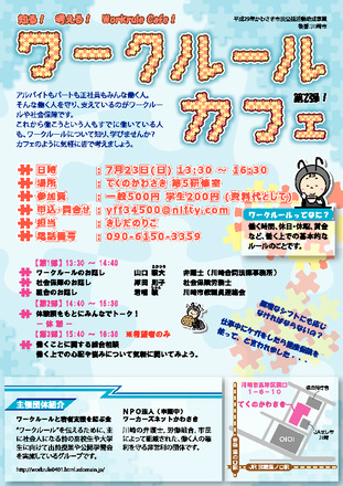 | ワークルールカフェを主催するワークルールと若者支援を結ぶ会様のチラシです。考える=パズルを組み立てる、というイメージで作成しました。 | |