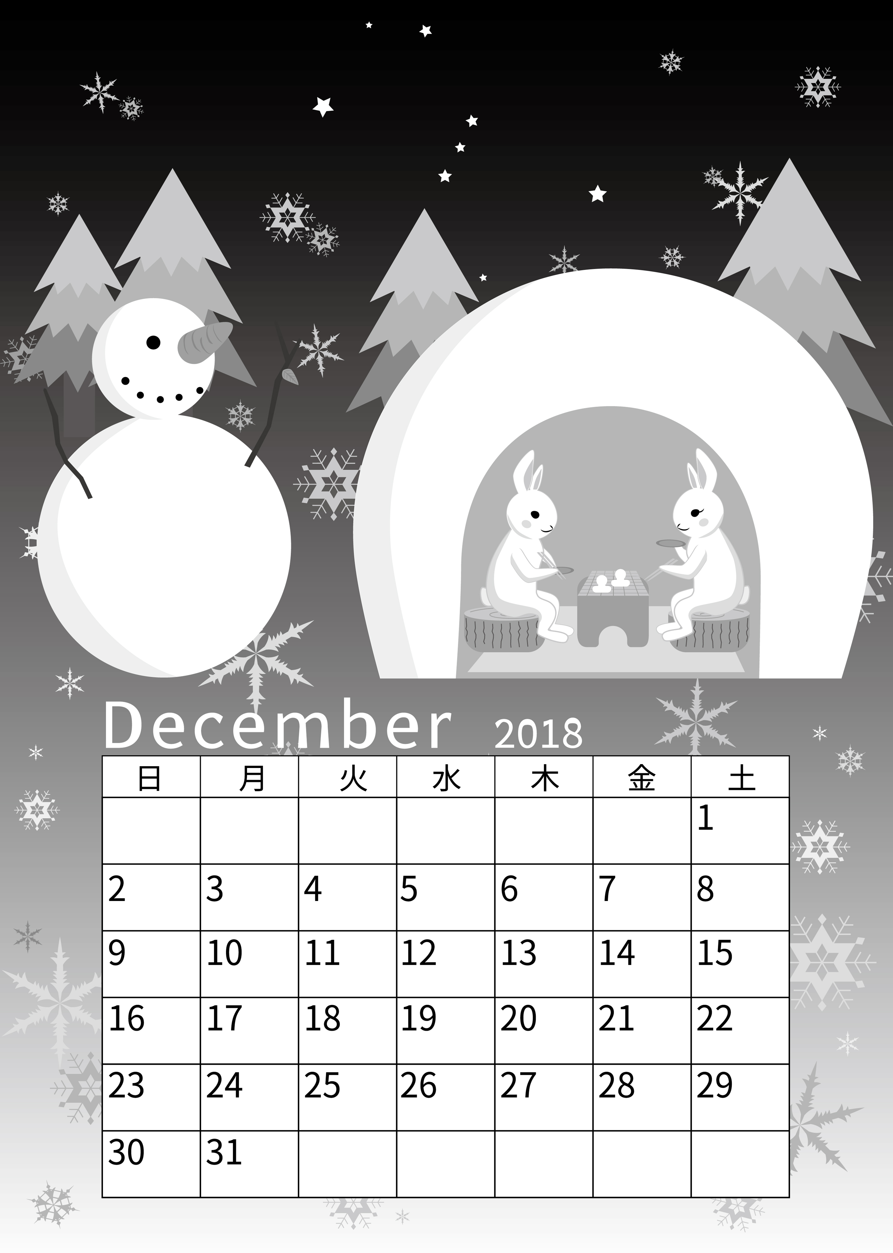 | 2018年12月のカレンダーです。クリスマスのイラストは多いと思うので、雪だるまやウサギをモチーフに。背景はクリスマス用にも使えると思います。 | |