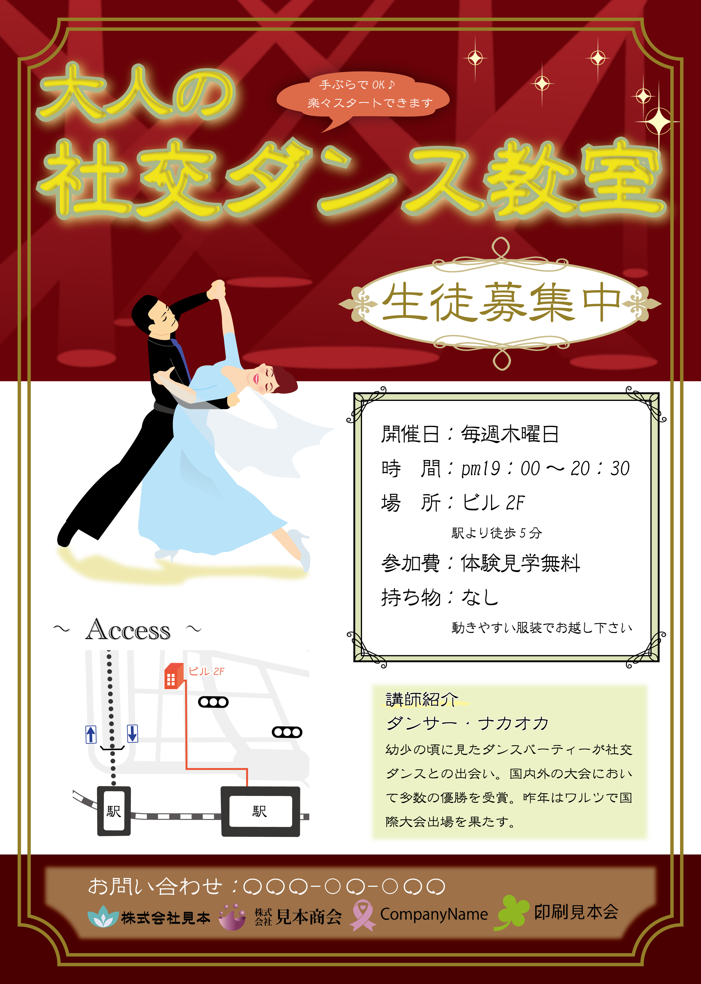 | 制作物名 | サンプルチラシ:架空の社交ダンス教室 |