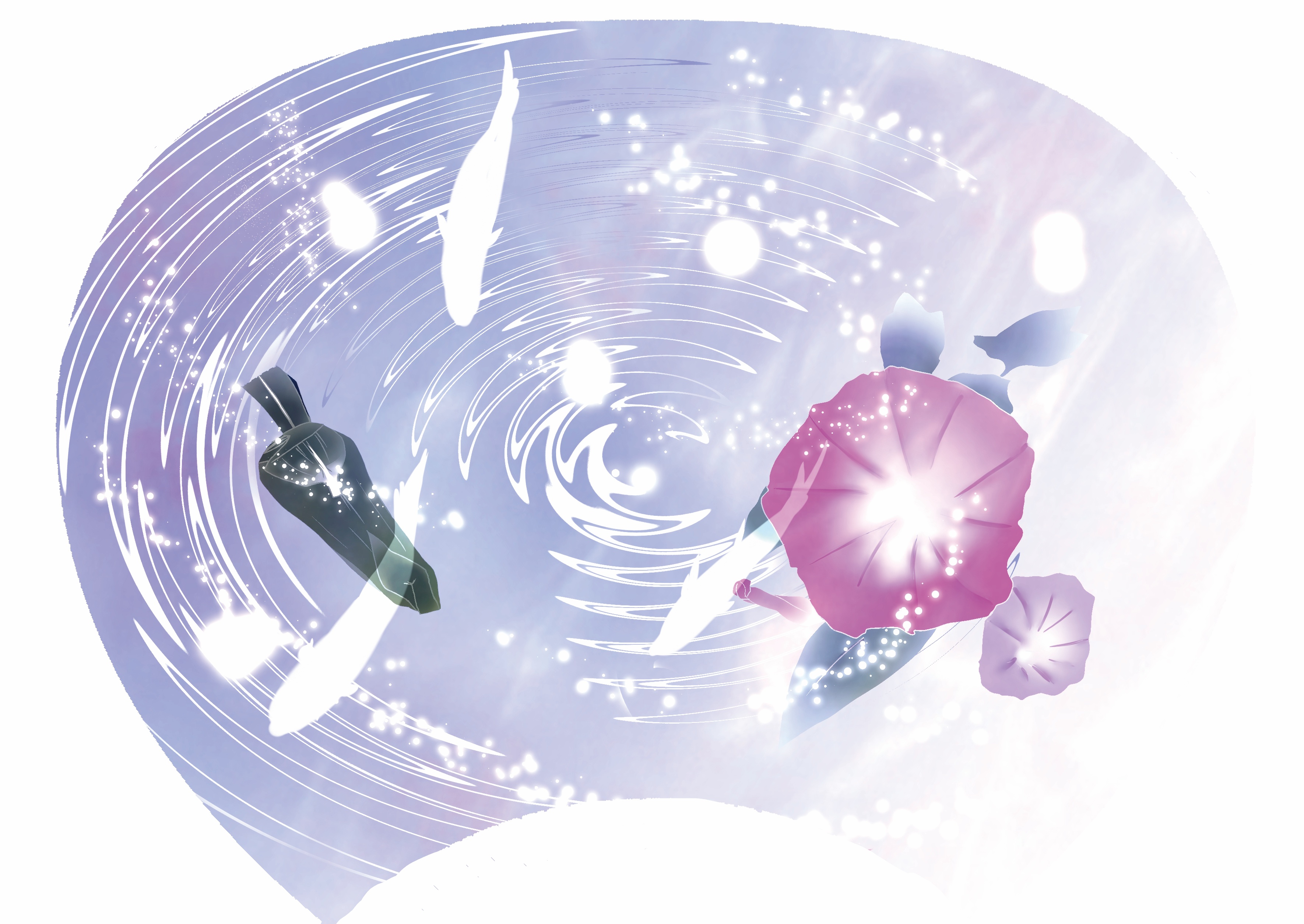 | 夏を連想する朝顔と懐かしい笹舟を組み合わせました。 泳ぐ魚と蛍の光、水面で涼しげに仕上げました。 | |