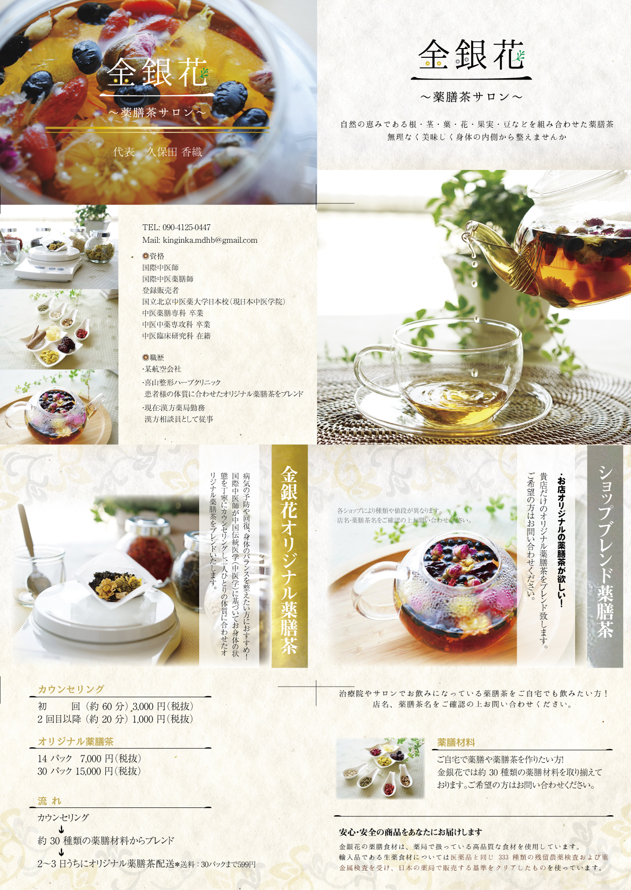 | 制作物名 | 金銀花〜薬膳茶サロン〜チラシ |