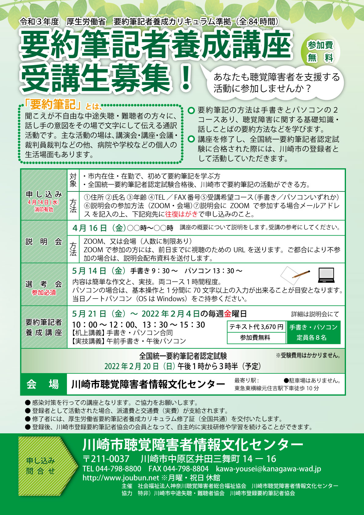 | 目的 | 要約筆記者養成講座受講生募集 |