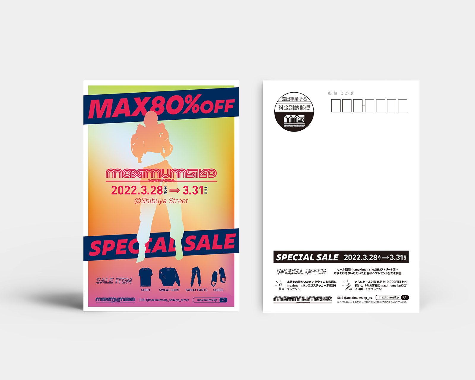| 課題として制作した[maximumskip]という架空のスポーツウェアブランドのDMデザインです。 ダンスなどを習うティーン層をターゲットにしたブランドで、格好良さと可愛らしさを合わせたデザインを目指しました。 | |