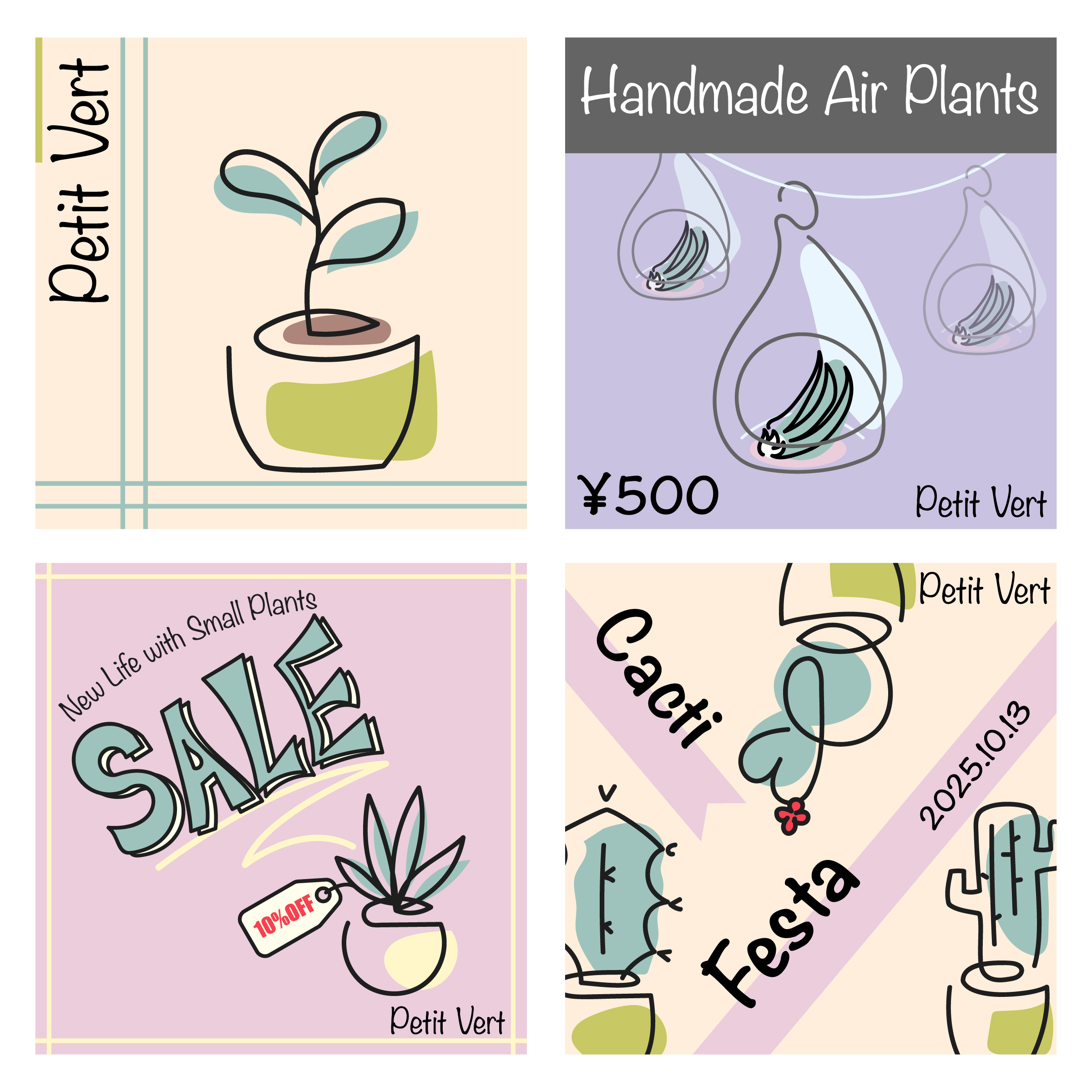 | 小さくてかわいい観葉植物屋さんの広告風です。 ニュアンスカラーでおしゃれな雰囲気に。 Instagram用のPOPです。 画像サイズ: 1080x1080px RGB | |