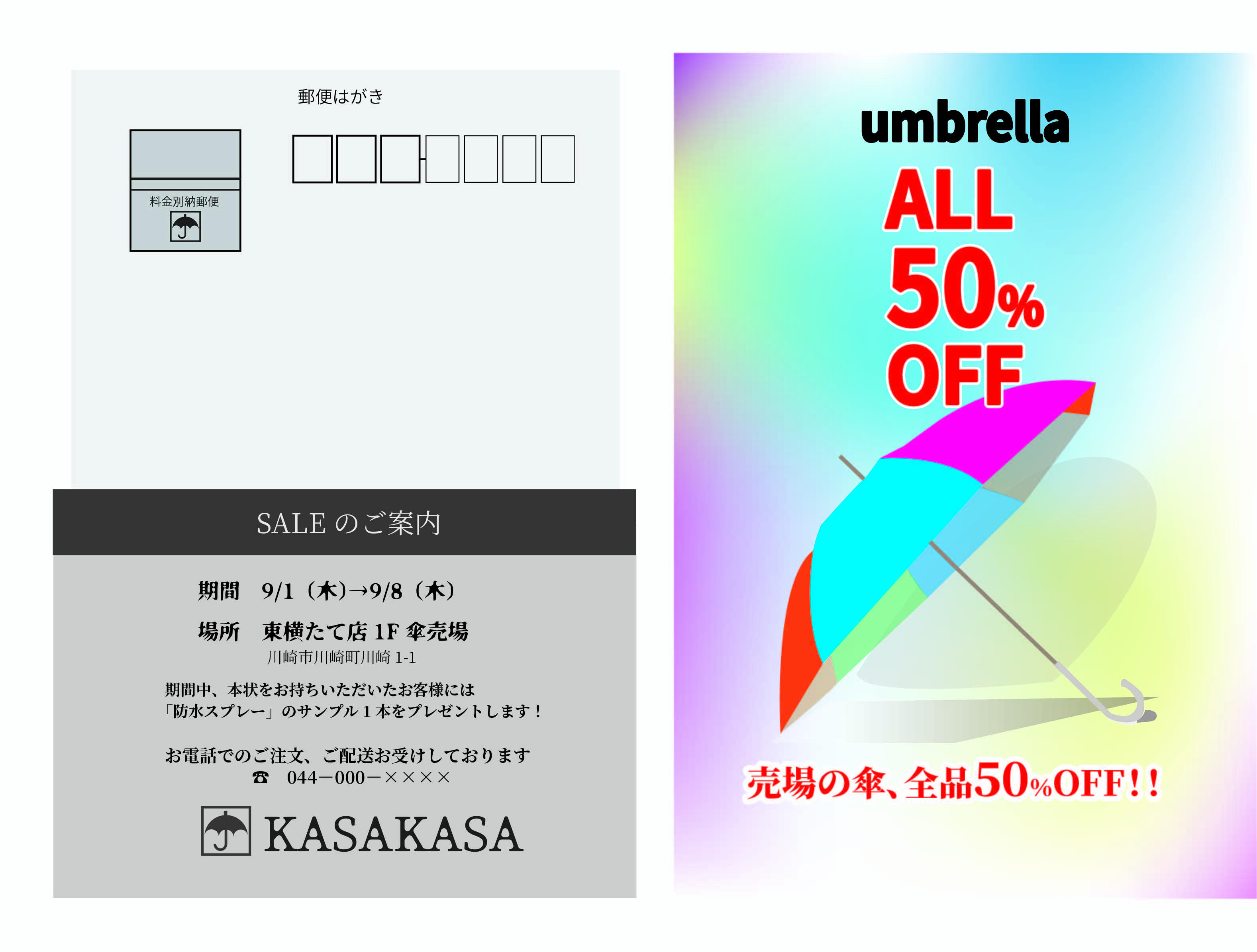 | 架空の会社による傘のSALE案内のDMはがきを作成しました | |