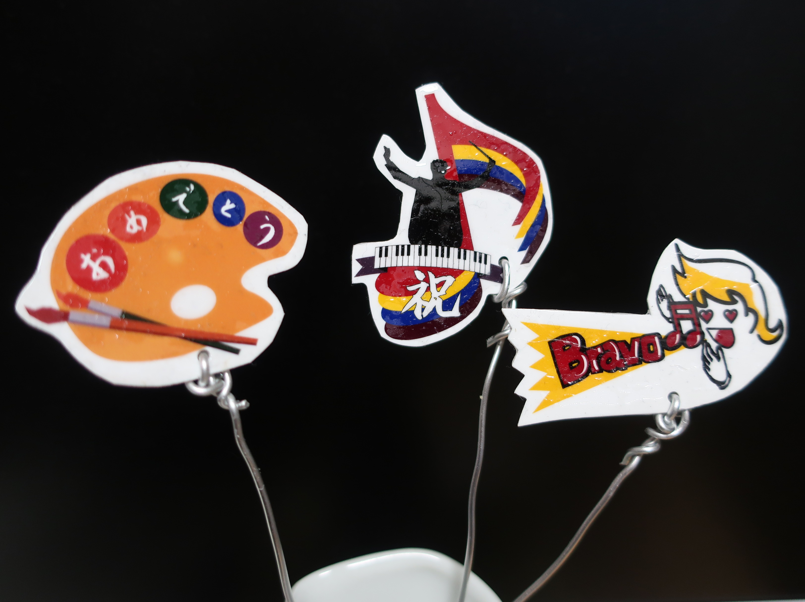 | お祝い持参花束(音楽会、絵画展など)用のフラワーピックです。 | |