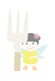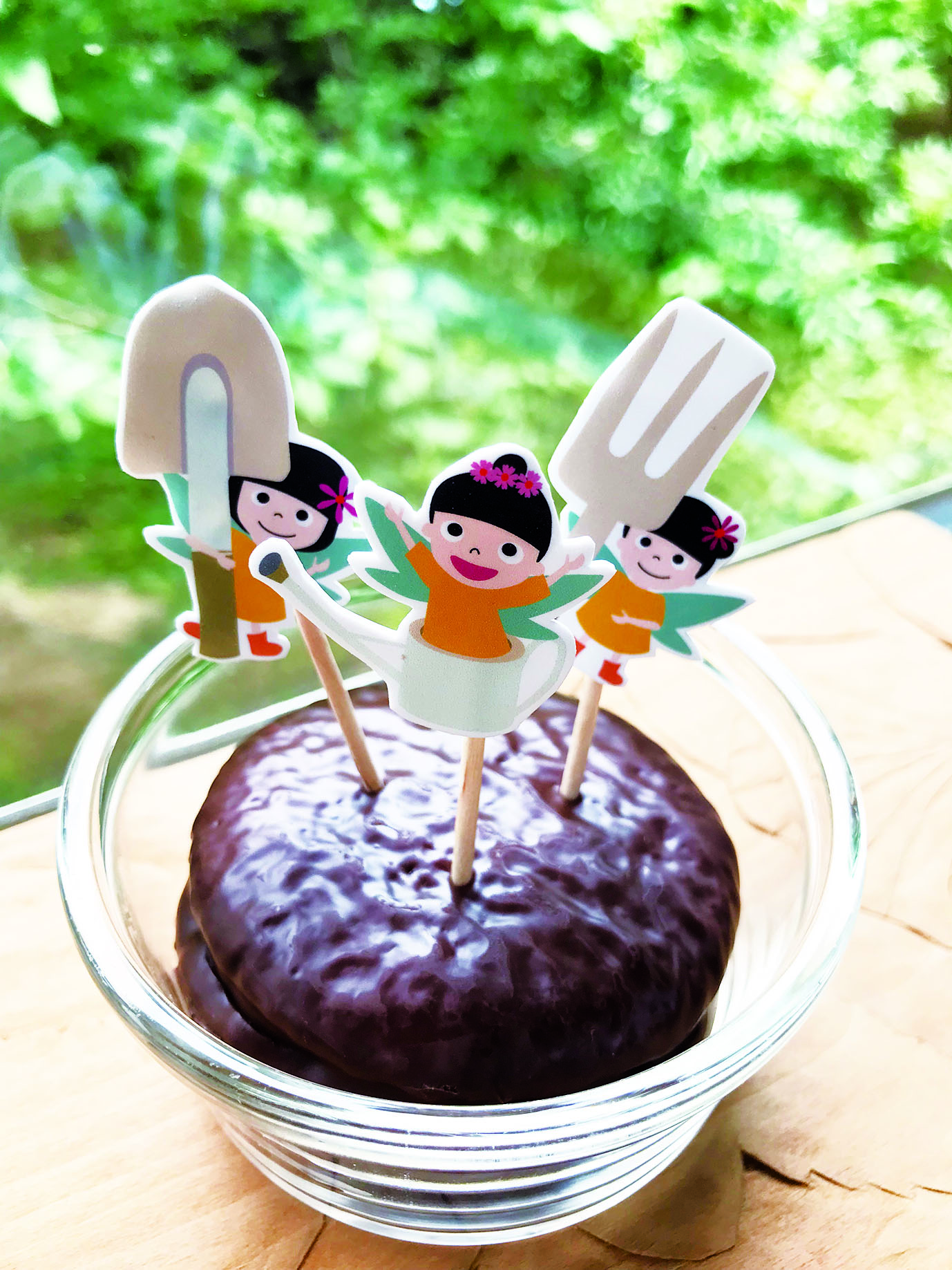 | ガーデニンググッズと一緒にいる花の精のガーデンピックです。 刺したのはチョコパイだけどね! | |