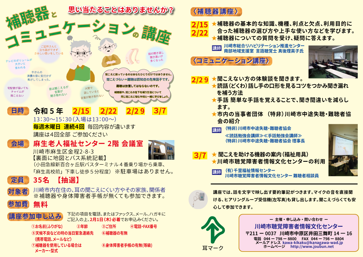 | 「補聴器とコミュニケーションの講座」のチラシ作りは3回目の練習課題になりました。デザインや編集の基本を身に付ける必要に迫られました。 | |