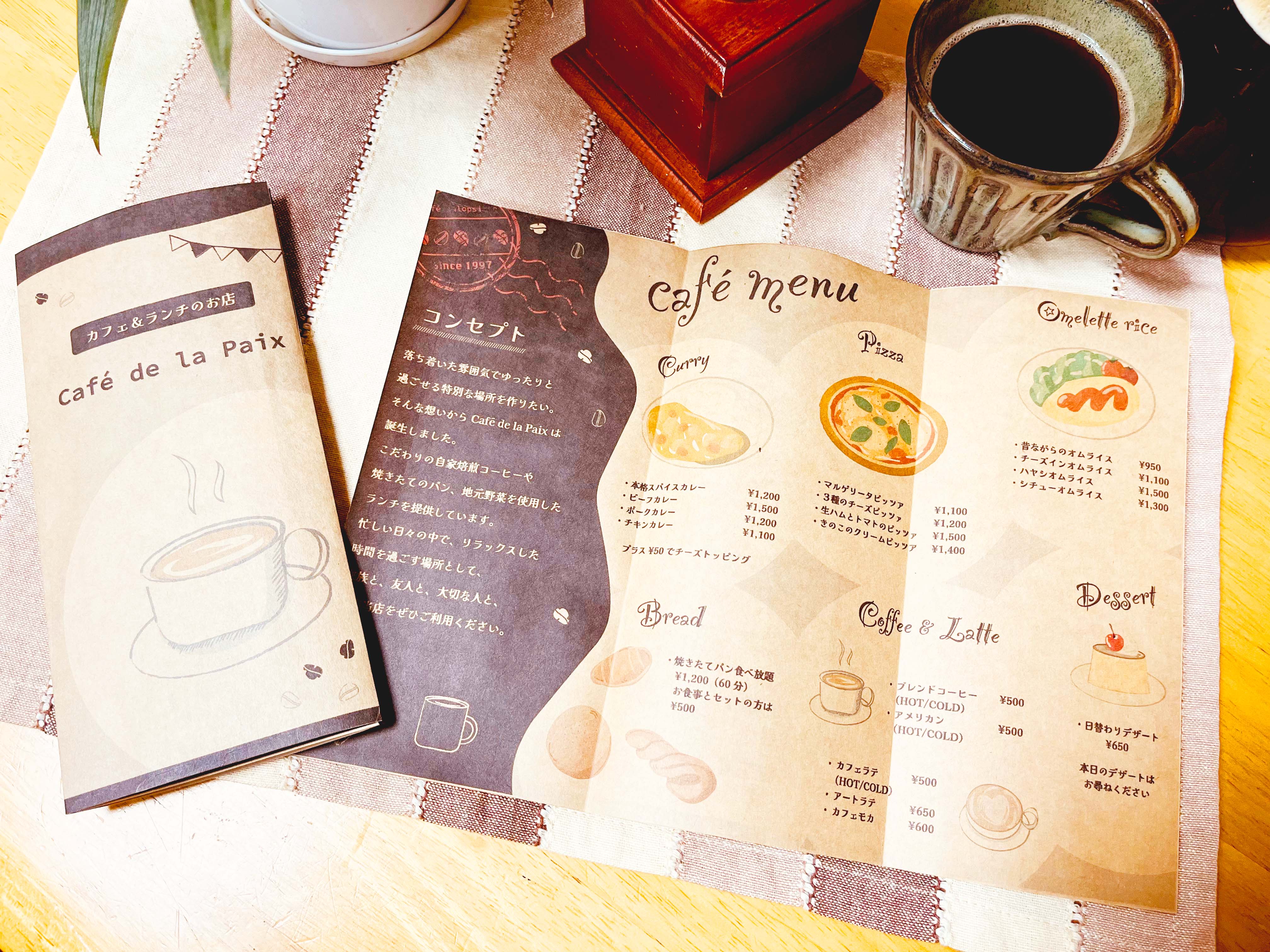 | 2023年冬イベント課題で作成した三つ折りリーフレットのテンプレートを使用して、架空のカフェのメニュー表を作成しました。 おしゃれで落ち着いた雰囲気のカフェをイメージして作成しました。 | |