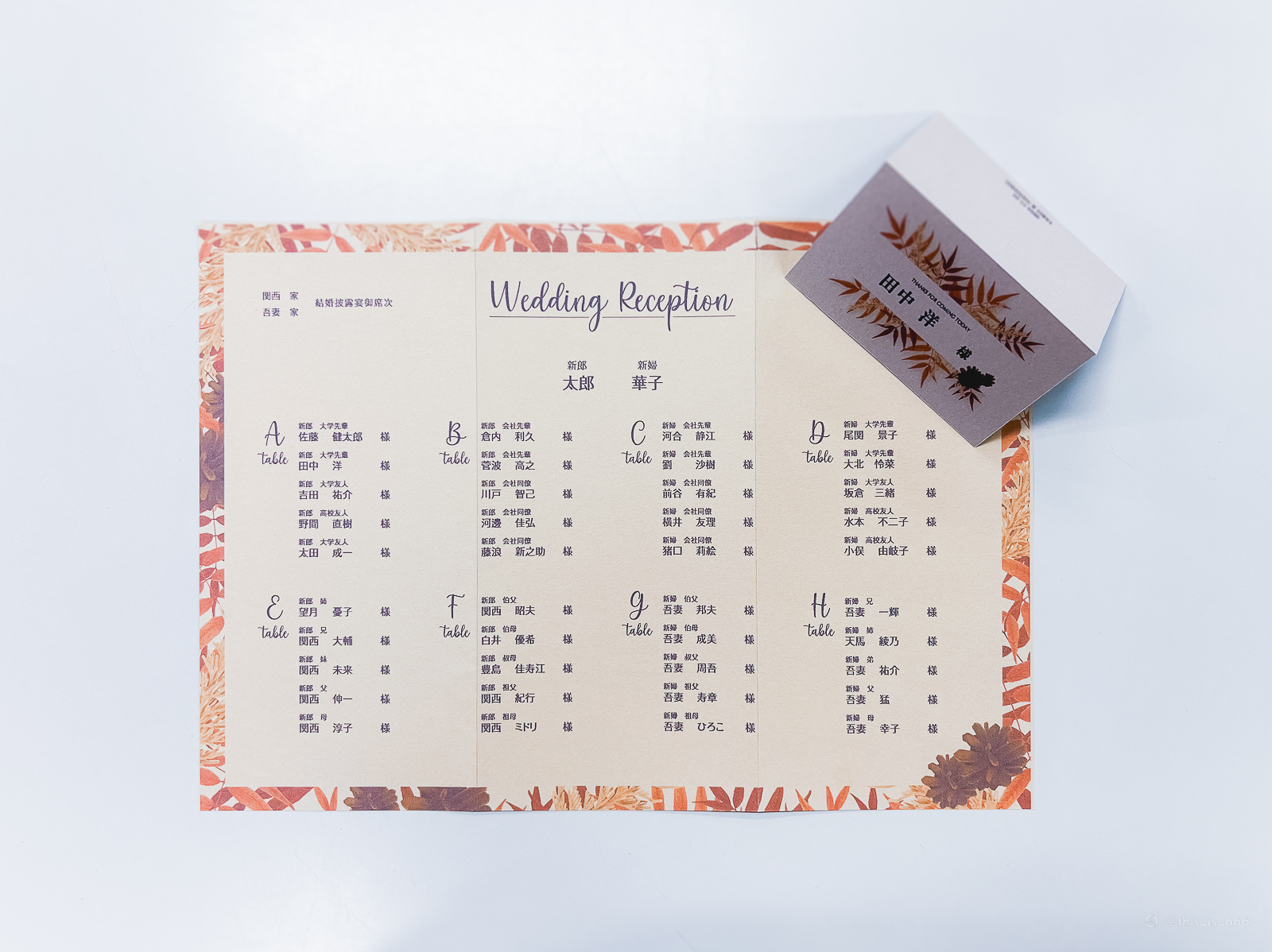 | 秋に結婚式を挙げる夫婦をコンセプトに制作したウエディング用ペーパーアイテムです。 紅葉のイラストと手書き風フォント合わせ、カジュアルな雰囲気を持つデザインを目指しました。 ■席次表 サイズ:297×210mm ■座札 サイズ:91×110mm | |
