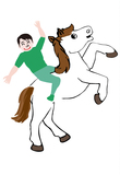 | 会の夏イベント課題として描き、後にプリントパックの公募にも応募しましたが落選。今回は14案作成しましたが、これはその十一作目。オーソドックスな年賀状、もう一工夫したり、ペンツールを上手に使えるようにしたいと思っています。今回は透明マスクの機能を使った作品が多いです。午年なので暴れ馬に乗ったロディオをイメージしたイラストを多用しました | |